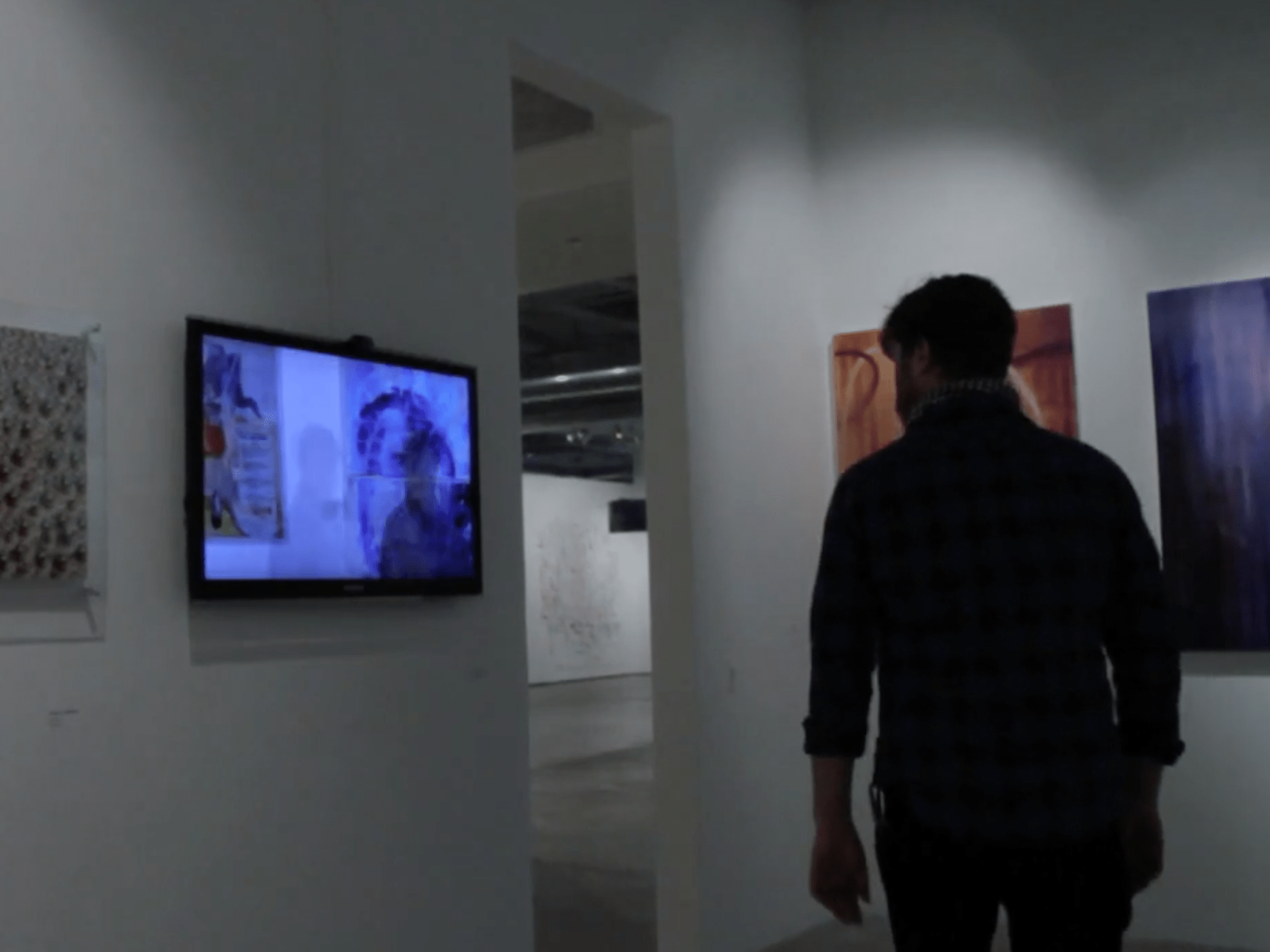 An interactive installation, At a time and place reacts to those in the gallery while recording their actions into memory. As a visitor moves they can scrub through the recorded history of the space peering back in time, however the more one interacts with the piece the more they overwrite the recorded history with themselves. This eventually will loop back on the visitor allowing them to both witness their own history while calling to attention their impact on the collective history of the room.